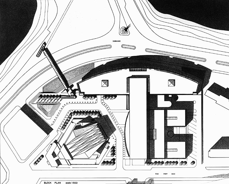 Con questo progetto si è voluta proporre un’architettura facilmente memorizzabile non solo come segno urbano o come struttura pubblica da usare nella vita di tutti i giorni ma anche come punto di riferimento per la cultura internazionale. La scelta di combinare insieme in maniera articolata alcuni codici contemporanei nasce dalla convinzione che sia proprio tale articolazione linguistica la “corretta” chiave progettuale della nuova biblioteca. Questo obiettivo è giustificabile se si tiene conto dell’importanza che l’istituzione della Nuova Biblioteca Alessandrina è destinata ad ereditare dalla sua antenata, la più famosa biblioteca del mondo antico (284-247 a.c.) ed una delle sette meraviglie del mondo. Al fine di ottenere questa multipla identità in un singolo complesso edilizio si ritiene che il linguaggio architettonico debba manifestare una totale appartenenza ai volumi progettati e al luogo, ed evitare attentamente ogni facile tentativo di soluzioni epidermiche. La posizione dell’area destinata alla sua costruzione, prospiciente il mar Mediterraneo, la conformazione ad “elle”, la presenza del già edificato Centro Congressi nel quadrante interno e la modesta qualità architettonica delle preesistenze ai due lati del lungomare “Corniche”, hanno suggerito, per la distribuzione dei volumi, una conformazione a “balestra”. In essa, l’arco con le sale di lettura occupa la posizione che offre l’affaccio sul mare mentre l’asta, che contiene in quota il deposito dei libri e a terra il portico di accesso alla biblioteca, occupa la posizione interna e di rapporto con le altre istituzioni presenti nel contesto. La differente qualità delle esposizioni è stata determinante per condurre all’adozione di uno schema in cui le sale di lettura si avvalgono di uno sviluppo lineare e sono tutte privilegiate rispetto al resto dell’intervento, grazie all’affaccio ombreggiato, verso nord sul mare. La necessità di lasciare la piena visibilità dell’esistente Centro Congressi dalla strada a scorrimento veloce denominata Corniche ci ha fatto imporre un limite di edificabilità su tale margine. La presenza del mare, e quindi, di una falda acquifera a tre metri sotto il livello altimetrico medio dell’area ha determinato la scelta di utilizzare un livello interrato ricavabile in tale spazio solo per i parcheggi, i locali per gli impianti e i servizi, ed ha orientato la progettazione verso una soluzione che sviluppasse fuori terra l’intero organismo edilizio. Il clima caldo e la forte esposizione ai raggi del sole hanno suggerito la localizzazione del grande volume contenente il deposito dei libri in posizione sovrastante gli altri spazi, in modo che questi ultimi ne venissero ombreggiati così da ottenere un vantaggio termico. Il rapporto di percorrenza tra la sala d’ingresso alla biblioteca, “Ptolemy hall”, e lo spazio dal quale si accede alle sale di lettura, “Callimachus hall”, sarebbe dovuto essere ascensionale al fine di lasciare la rimanente parte del livello terra libera dagli spazi per la lettura e utilizzabile per le molteplici funzioni ricettive richieste dal bando. “Callimachus hall” avrebbe dovuto avere una grande apertura in direzione nord, verso il mare, per rendere continuamente percepibile la situazione geografica e l’orientamento dell’edificio da tale spazio. Gli accessi alla biblioteca, sia carrabili che pedonali, sarebbero dovuti avvenire dalla strada denominata “Port Said” che si trova in posizione interna rispetto al fronte mare, dato che è su di essa che gravitano i centri culturali universitari e congressuali e che, a differenza della Corniche, è un asse di scorrimento veicolare lento. Il corretto funzionamento di tale impianto edilizio a forma di balestra (con il deposito dei libri distribuito su sei piani di un prisma sollevato dal suolo e le sale di lettura distribuite sui diversi livelli del volume a forma di arco) è un obiettivo facilmente perseguibile se il punto d’incontro tra i due volumi contiene tutti gli elementi necessari a garantire una facile distribuzione dei libri nonché una funzionale circolazione del personale addetto. Tali requisiti sono qui ottenuti per mezzo di un sistema strutturale a colonne cave in c. a. di pianta quadrata, che svolge la duplice funzione di sorreggere il deposito e di collegarlo ai diversi piani delle sale di lettura. Queste colonne, di ml. 4,10 di lato, contengono le scale di sicurezza, gli ascensori e i montacarichi, e realizzano il collegamento del deposito con il livello terra ogni venti metri. Il deposito, così sollevato dal suolo, oltre ad ombreggiare le sale “Callimachus” e “Ptolemy” garantisce un perfetto isolamento dei libri all’umidità, e inondazioni, oltre a vanificarne i pericoli di danni provenienti da possibili incendi. Inoltre, lo spazio esterno sottostante questo grosso volume, genera un grande portico monumentale che giace sull’asse del campus universitario e che si rende utilizzabile anche dall’esistente Centro Congressi. Attestati a questo portico trovano collocazione la scuola internazionale di formazione disciplinare e il centro conferenze che sono parti integranti della biblioteca. La scelta di combinare insieme in maniera articolata alcuni codici contemporanei quali razionalismo, brutalismo ed espressionismo, è stata compiuta perché si riteneva che il significato storico in chiave moderna di quest’opera in quel luogo potesse essere rintracciato, sia sul piano dell’espressione che su quello del contenuto, in una loro accurata miscela. Questa articolazione linguistica mostra due momenti dell’edificio: la pelle, ovvero la parte più esterna, motivata dalla necessità di proteggere dai raggi del sole il volume interno, che consiste in un muro riccamente scolpito con grosse aperture e piccole finestre, avente un andamento continuo e curvilineo sia planimetricamente che altimetricamente, e nel quale sono ricavati, ai piani terra e pr
